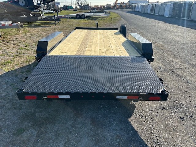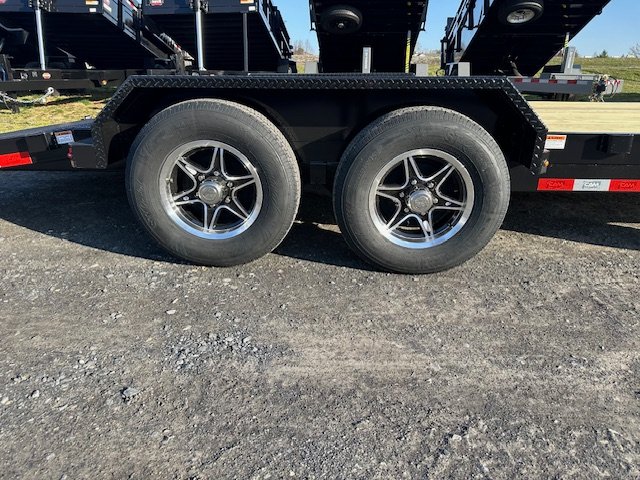 Slide Out Ramps 12″W x 60″L , Wood Deck 82″W x 18’L, 4′ Diamond Plate Beavertail, Electric Brakes, 5200lb Spring Axles, Tires 225/75/R15, Adjustable Coupler, Stake Pockets, 7K Jack with Drop Leg, LED Lights, Safety Chains, 7-Way RV Style Electrical Plug, Removable Driver’s Side Fender, Aluminum Wheels, Matching Spare