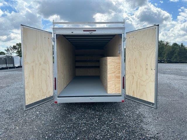 Aluminum Ladder Racks, Interior Deck 80″ W x 18’ L, Rear Doors 77″ W x 74″ T, Side Door 36″ W x 75″ T, Interior Height 80″ T, Reinforced Walk On Roof, 110V Inlet, 3/4″ Plywood Flooring, Electric Brakes, 6000lb Torsion Axles, Tires 225/75/R15 Radials, Tool Compartment Package, 18″ Deep Compartments Made From 3/4″ Plywood, One 72″W x 24″T Compartment Door, Two 24″W x 48″T Compartment Doors, 6″ Added Height