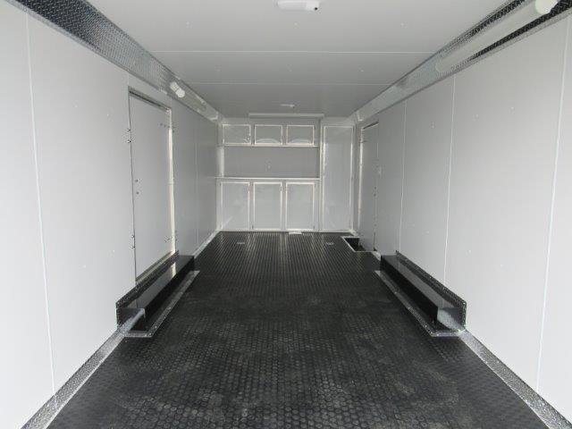 Rear Ramp Door, Side Door and Get Out Door 48″W x 60″T, Electric Brakes all Four, Deck 96″W x 24’L, Rear Door 94″W x 76″T, Interior Height 80″, 6000lb Torflex Axles, Tires 22575R15 Radial, 2-5/16″ Coupler, Screwless Exterior, Wall Vents, Insulated Ceiling, White Vinyl Walls and Ceiling, Rubber Coin Floor & Ramp, 110 Light Package, Upper and Lower Cabinets with Side Wardrobe, 4 Heavy Duty Tie Downs, Aluminum Wheels