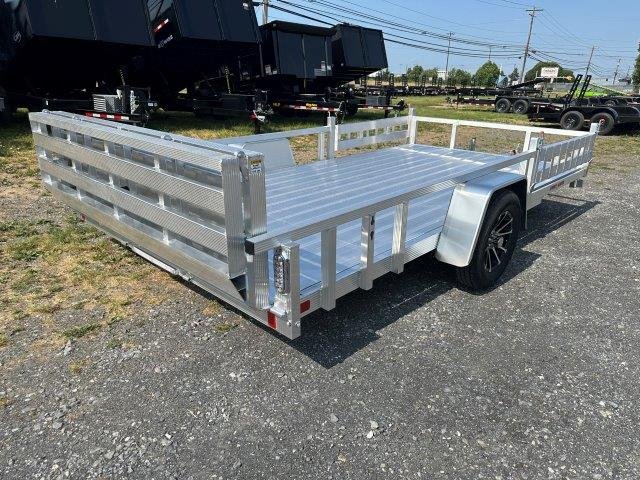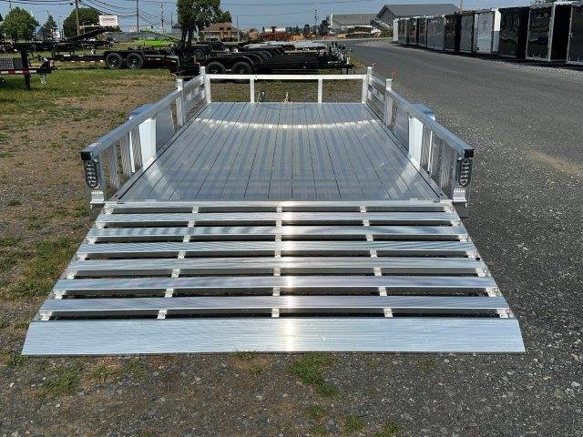 Rear Aluminum Ramp Gate, No Brakes, Deck 83″W x 14’L, Rear Bi-Fold Gate 83″W x 4’H, Removable Side ATV Ramps 11″W x 60″L, Tires ST20575R15 Radial, 2″ Ball Coupler, All Aluminum Frame, A Frame Tongue, Flat 4 Wiring, LED Lighting, Swivel Jack, 3500 lb Spring Axle, Aluminum Deck, 4 D-Rings